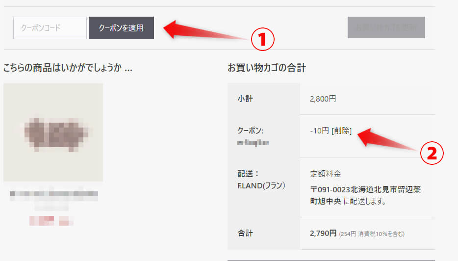 それぞれクーポンを入力したら「クーポンを適応」ボタンを押して確定してください。(①)